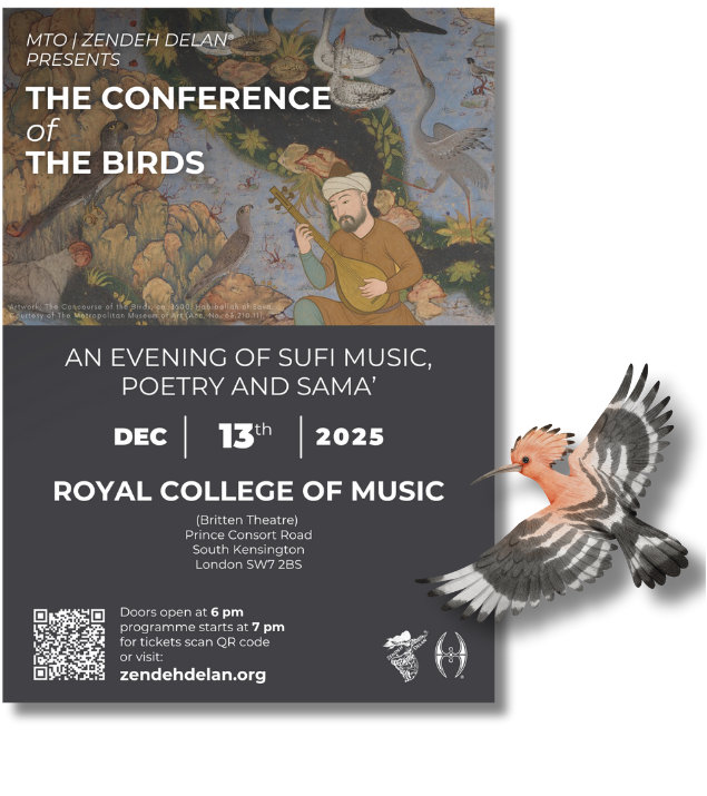 Following the success of Journey of Love: Layla and Majnun, Zendeh Delan proudly presents its next major program, The Conference of the Birds, a journey through the mystical valleys of the soul, inspired by the timeless Persian poem of Farid ud-Din Attar. Through music, Sama’, and poetic narration, this presentation invites audiences to experience the path of love, unity, and self-realisation in an immersive, transcendent setting.